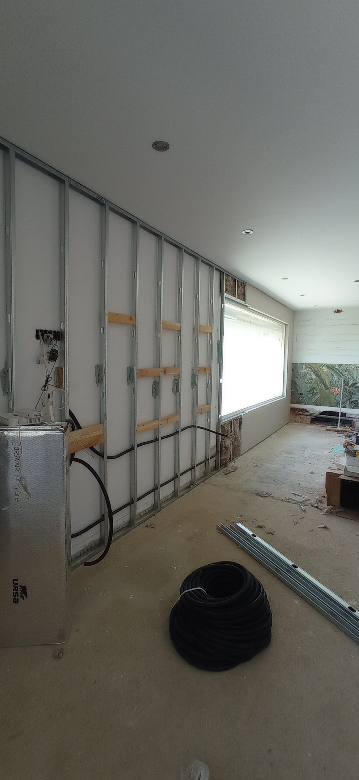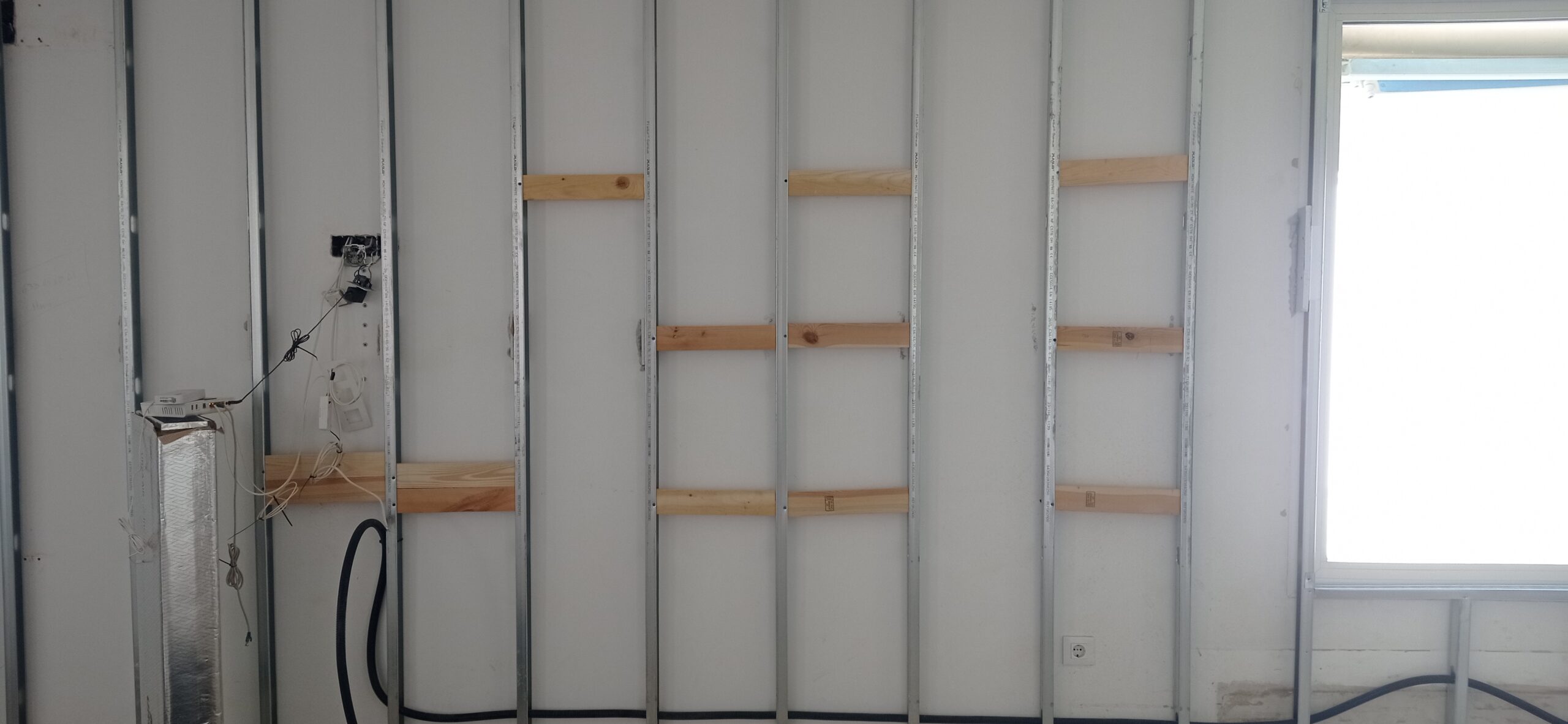 Se han ejecutado trasdosados autoportantes con estructura metálica a base de perfiles con modulación a 400 mm, revestidos con placa de yeso laminado de 15 mm de espesor. En su interior se ha incorporado aislamiento térmico y acústico mediante lana de roca mineral de 50 mm, mejorando el confort térmico y la atenuación acústica del recinto.