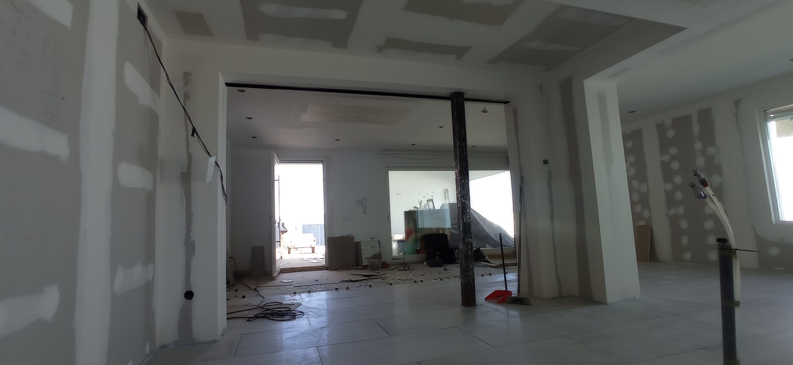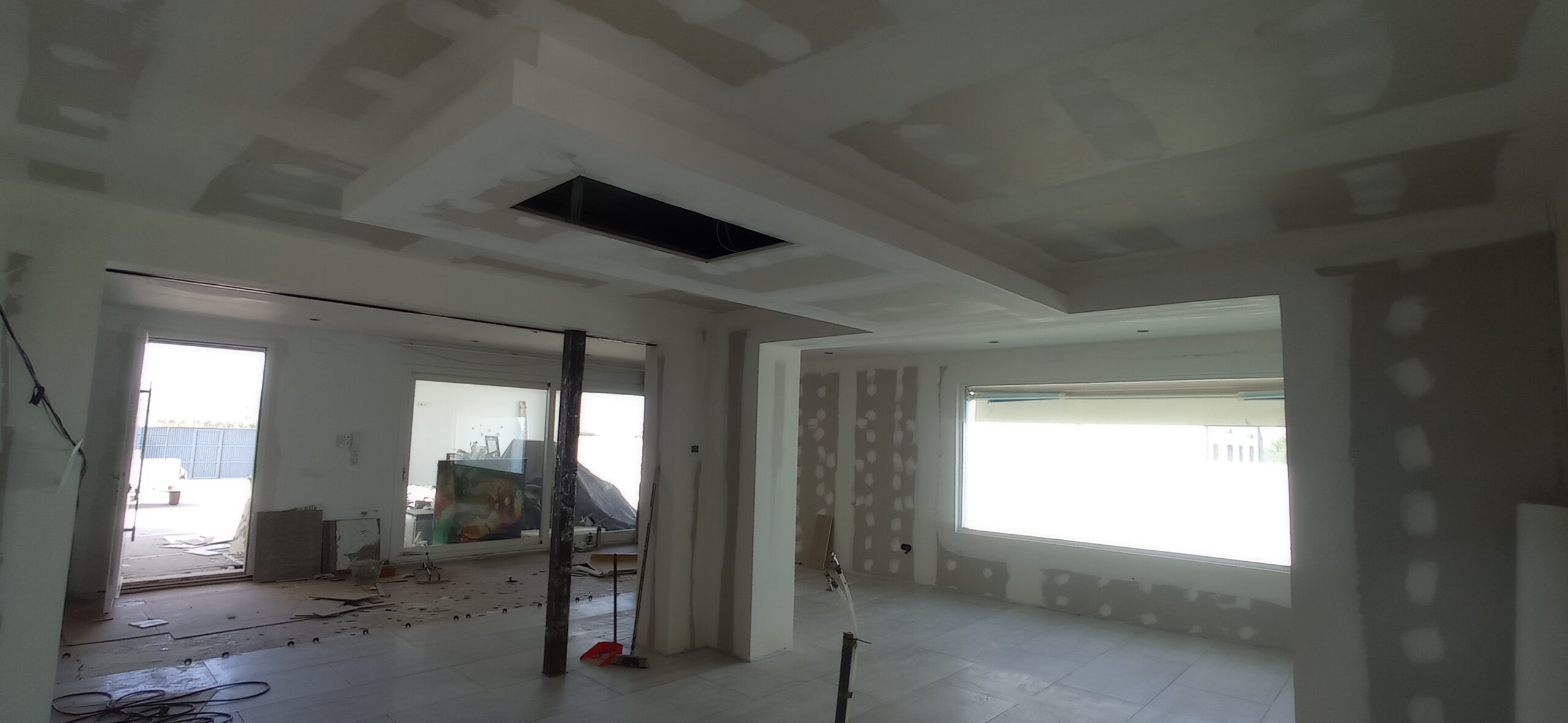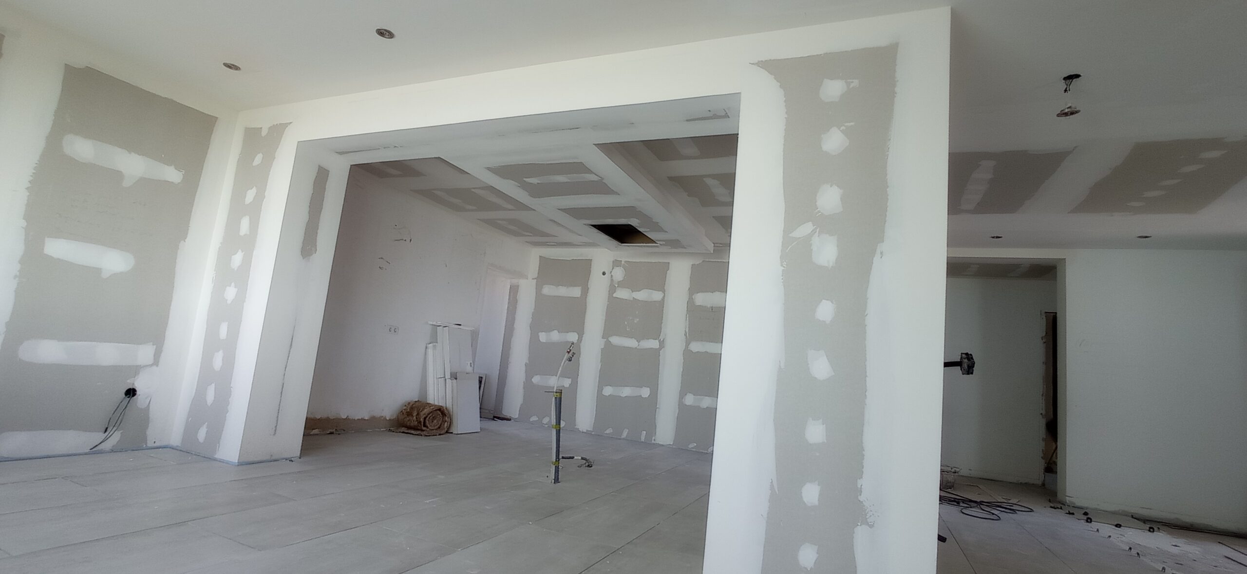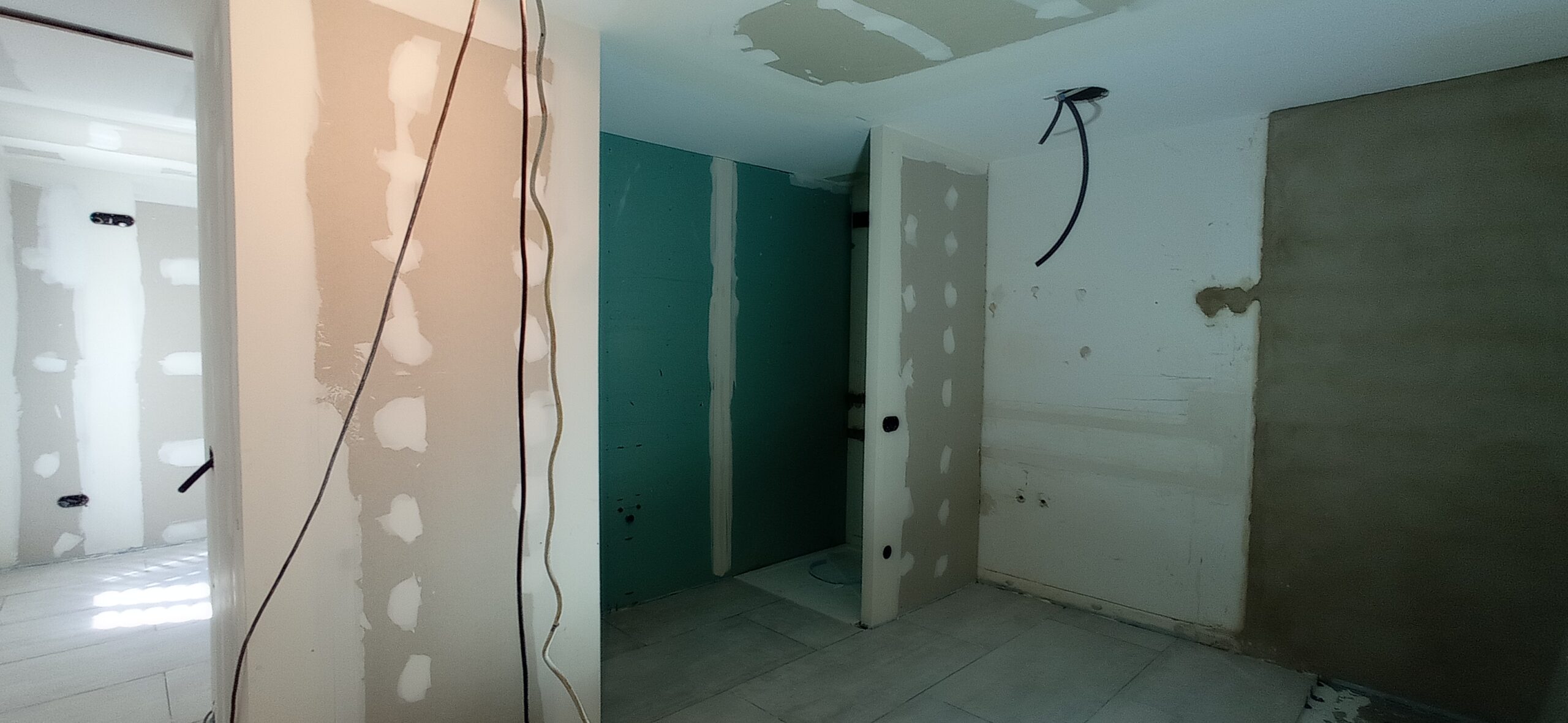 Los tabiques interiores se han levantado con perfilería metálica modulada a 400 mm, revestida por ambas caras con placa de yeso laminado de 15 mm de espesor, garantizando una correcta resistencia mecánica y un buen acabado superficial para posteriores tratamientos decorativos.