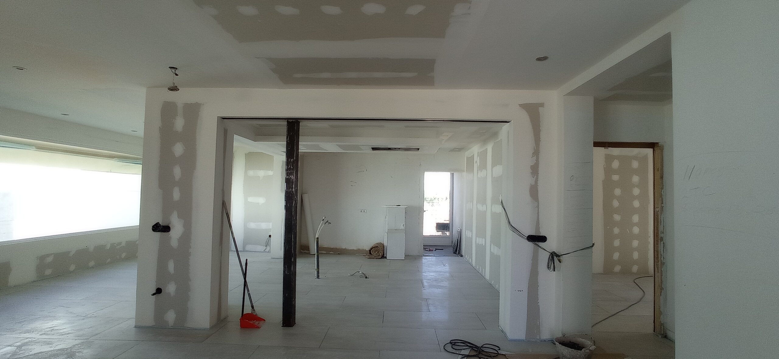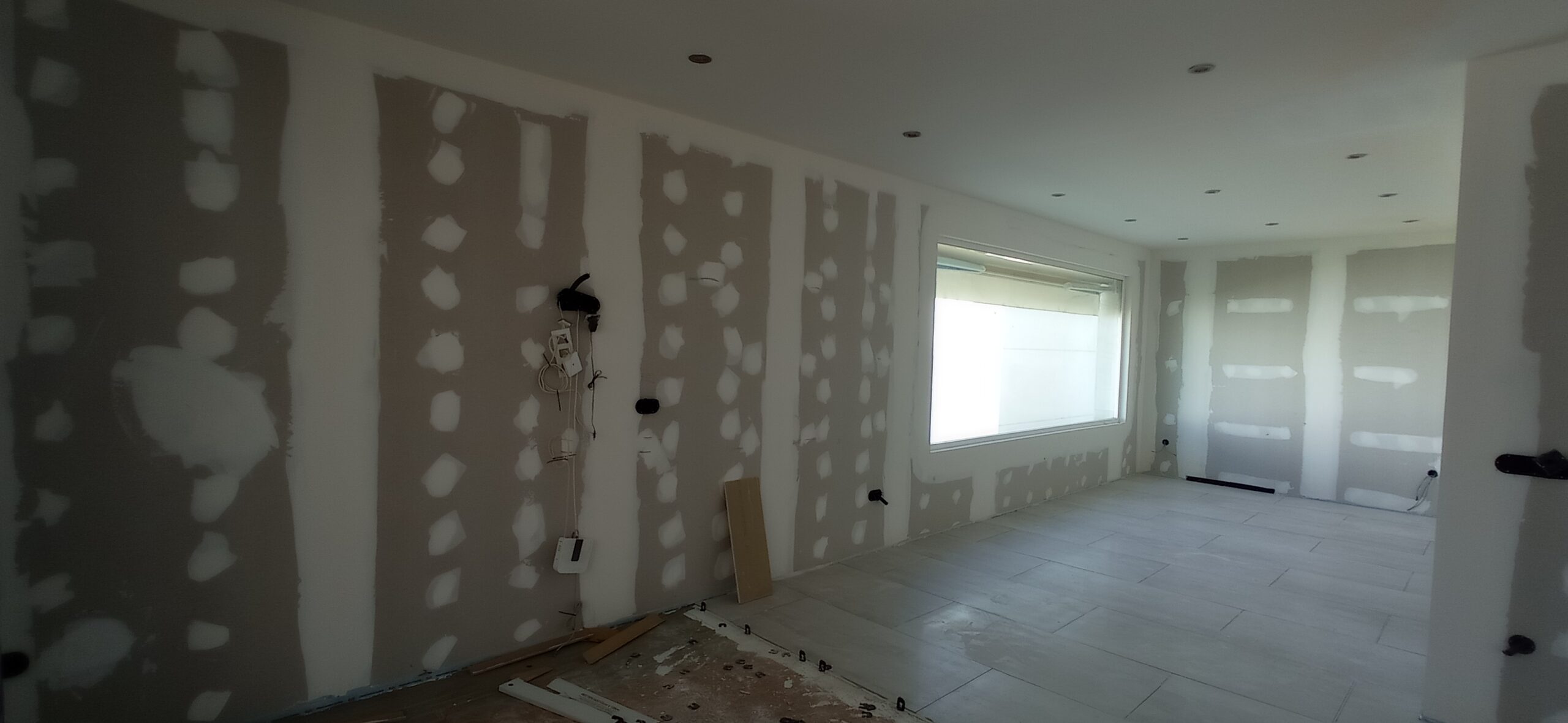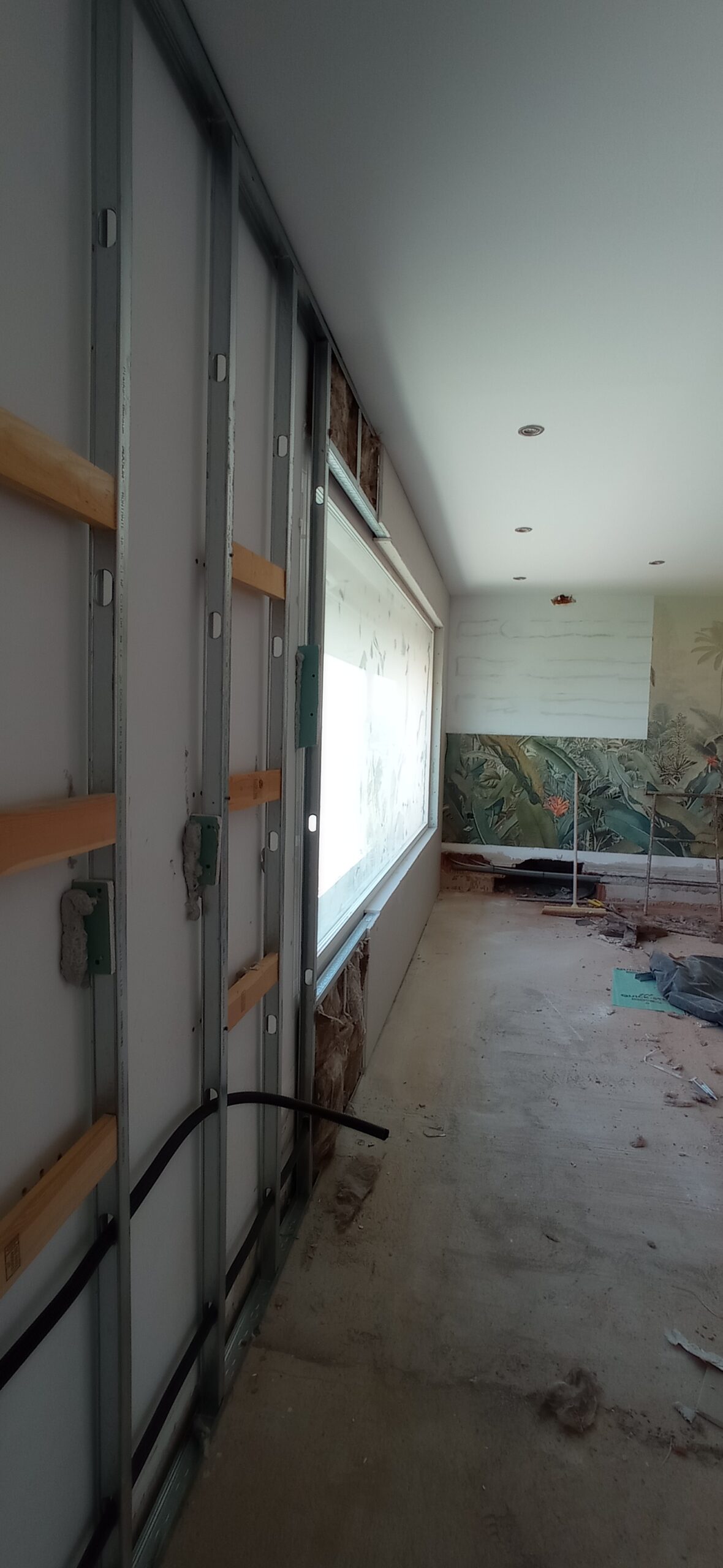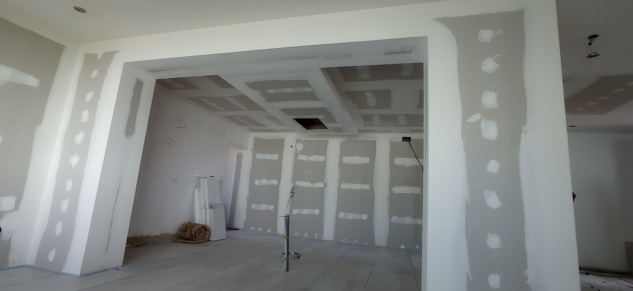Los tabiques interiores se han levantado con perfilería metálica modulada a 400 mm, revestida por ambas caras con placa de yeso laminado de 15 mm de espesor, garantizando una correcta resistencia mecánica y un buen acabado superficial para posteriores tratamientos decorativos.