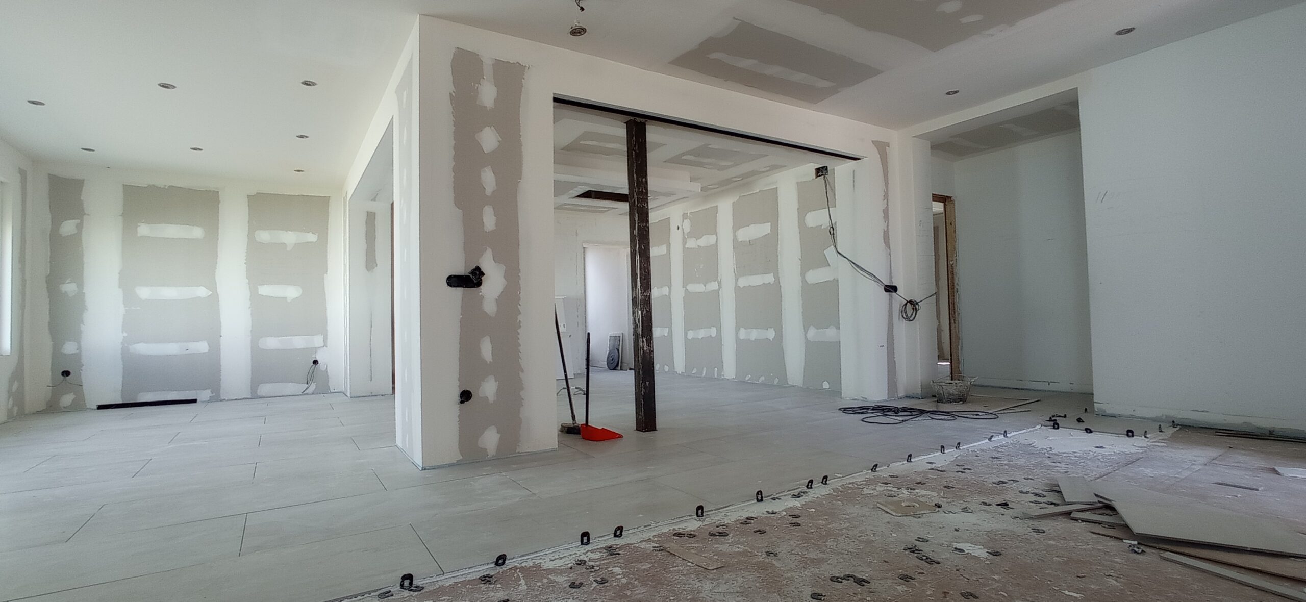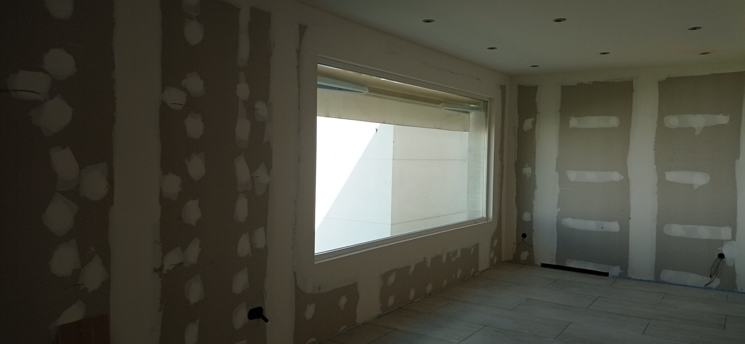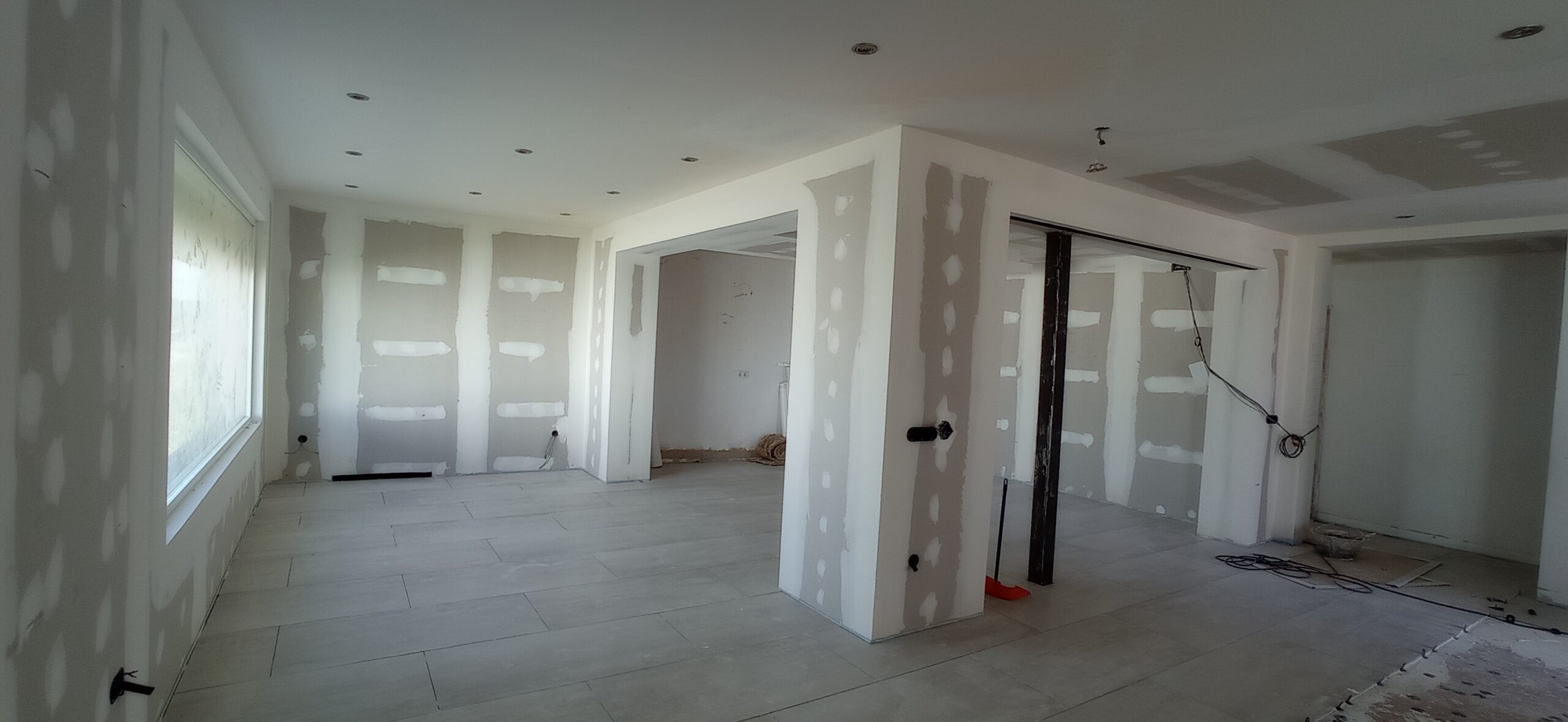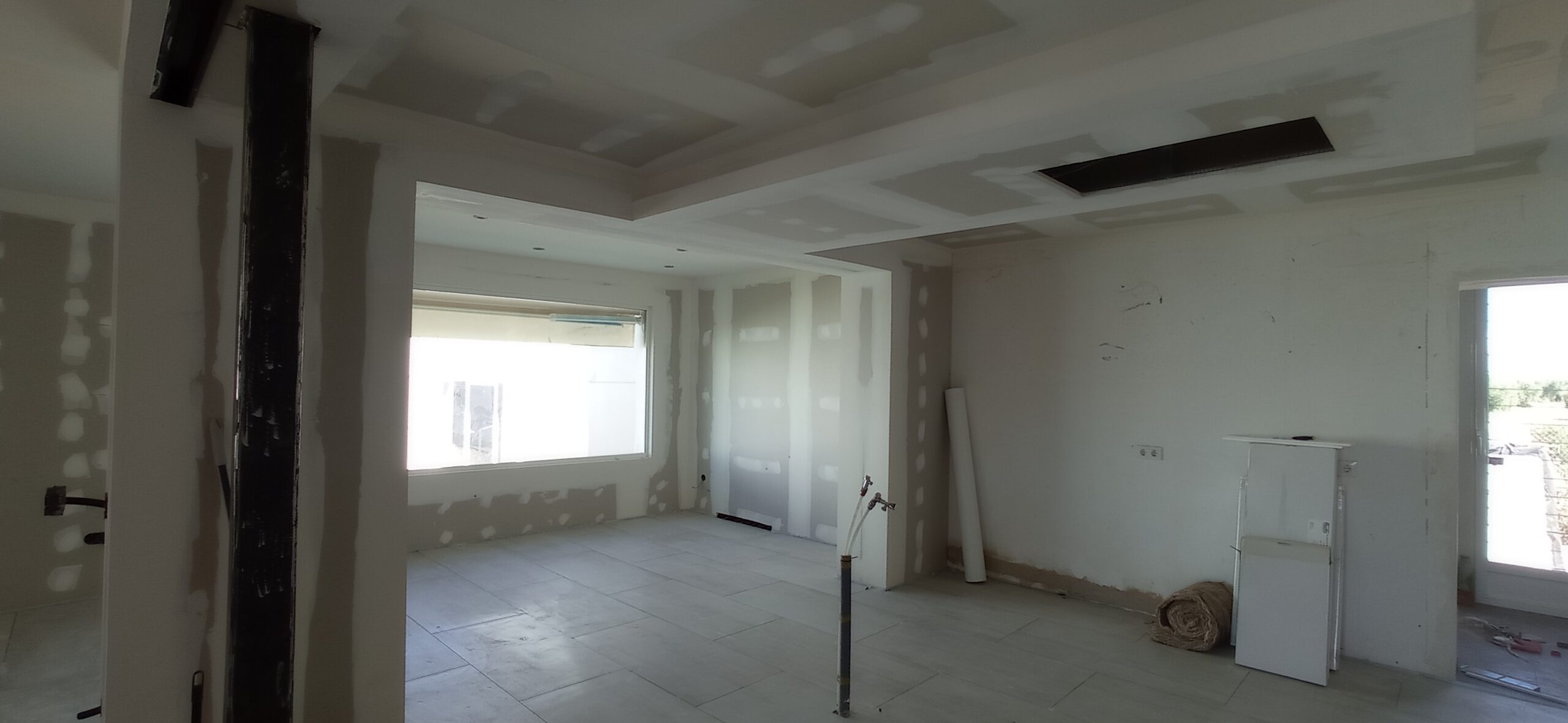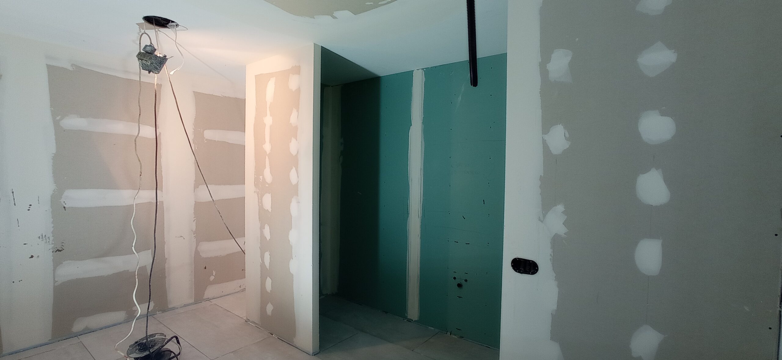 Los tabiques interiores se han levantado con perfilería metálica modulada a 400 mm, revestida por ambas caras con placa de yeso laminado de 15 mm de espesor, garantizando una correcta resistencia mecánica y un buen acabado superficial para posteriores tratamientos decorativos.
