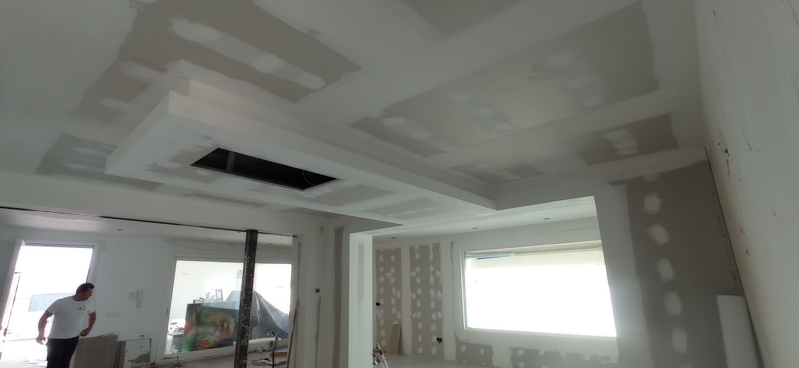 En el techo continuo de las estancias principales se ha ejecutado una isleta decorativa con diseño especial que oculta completamente el extractor de cocina, integrándolo estéticamente en el conjunto sin comprometer su funcionalidad.