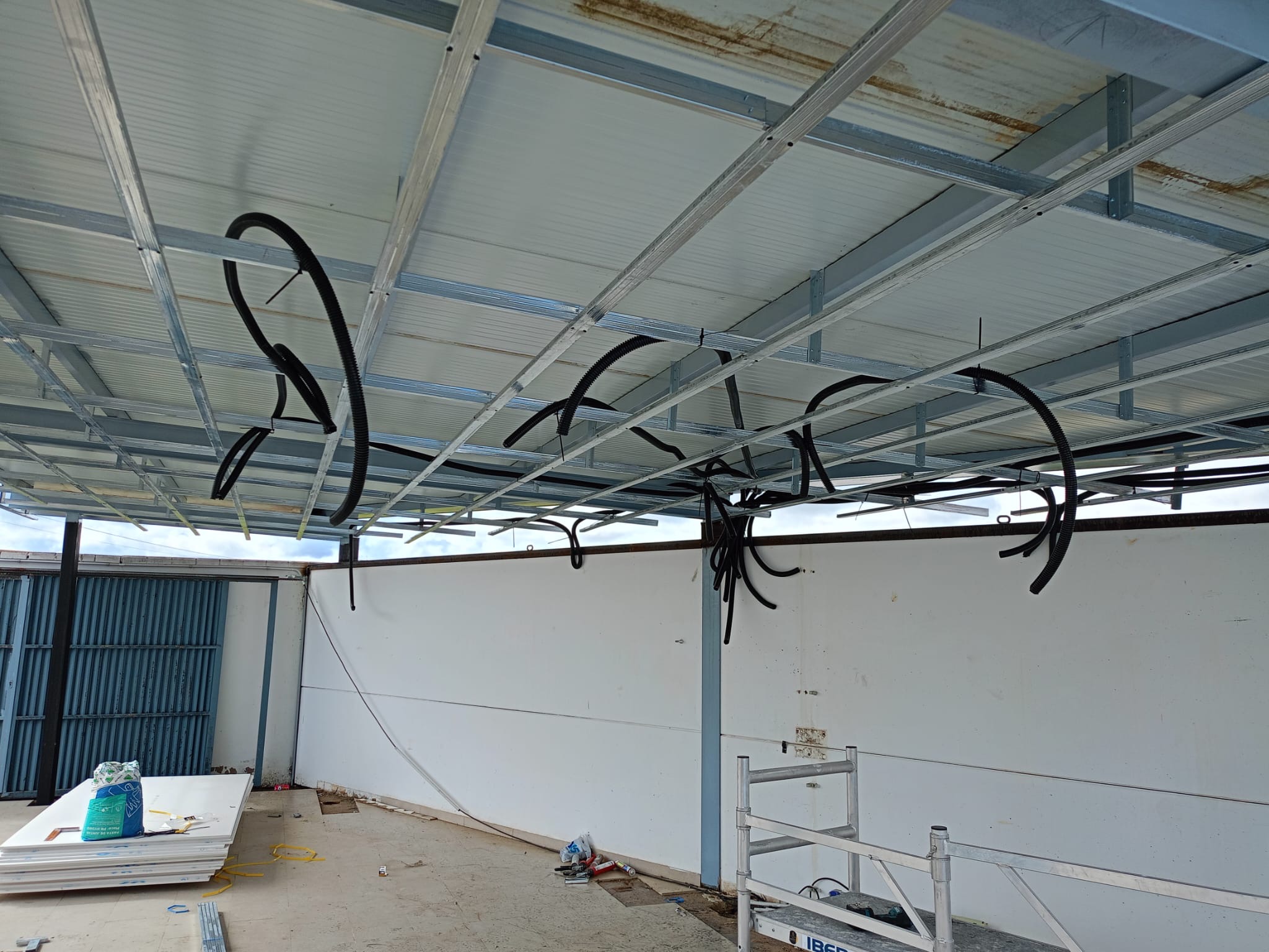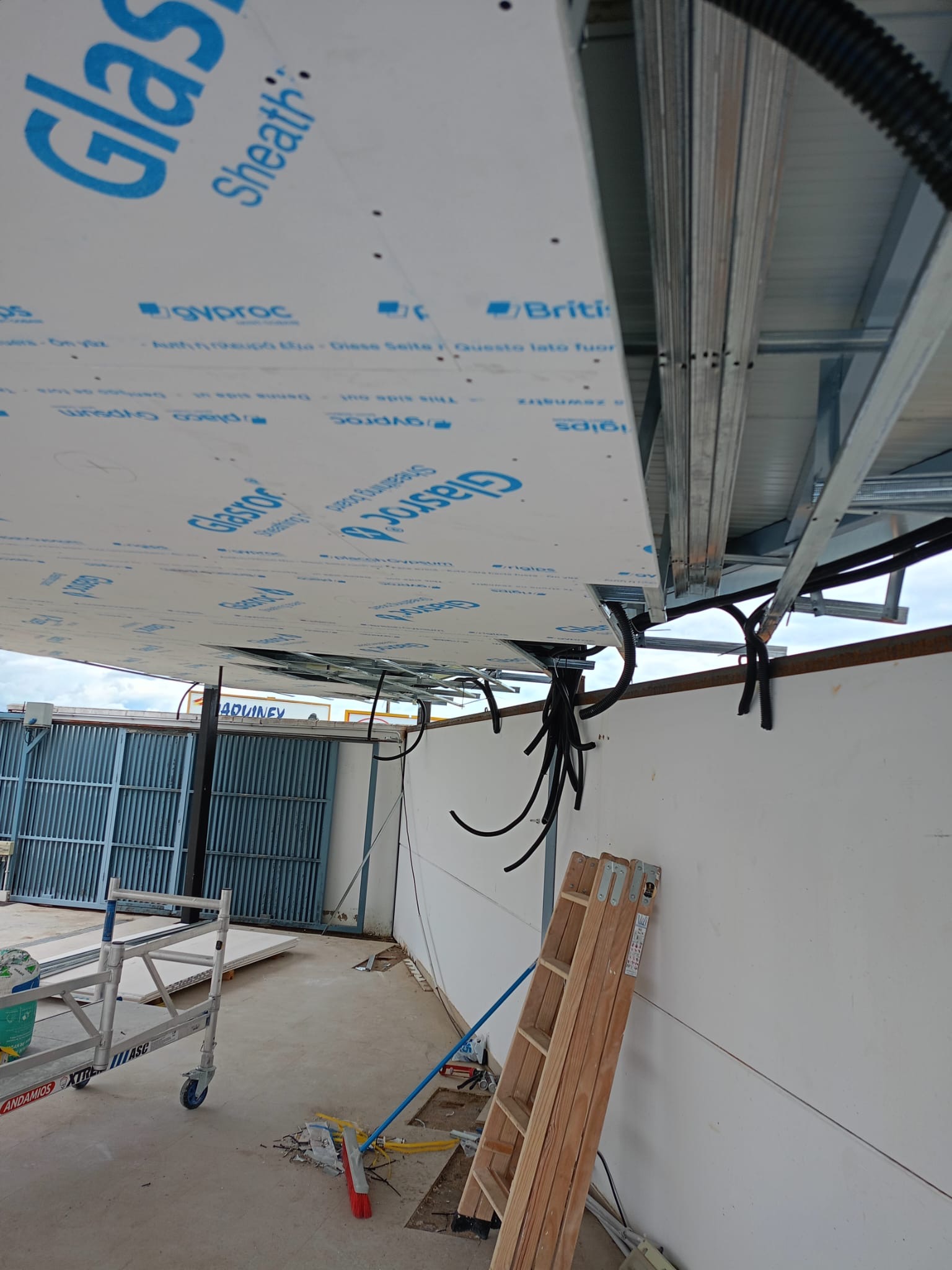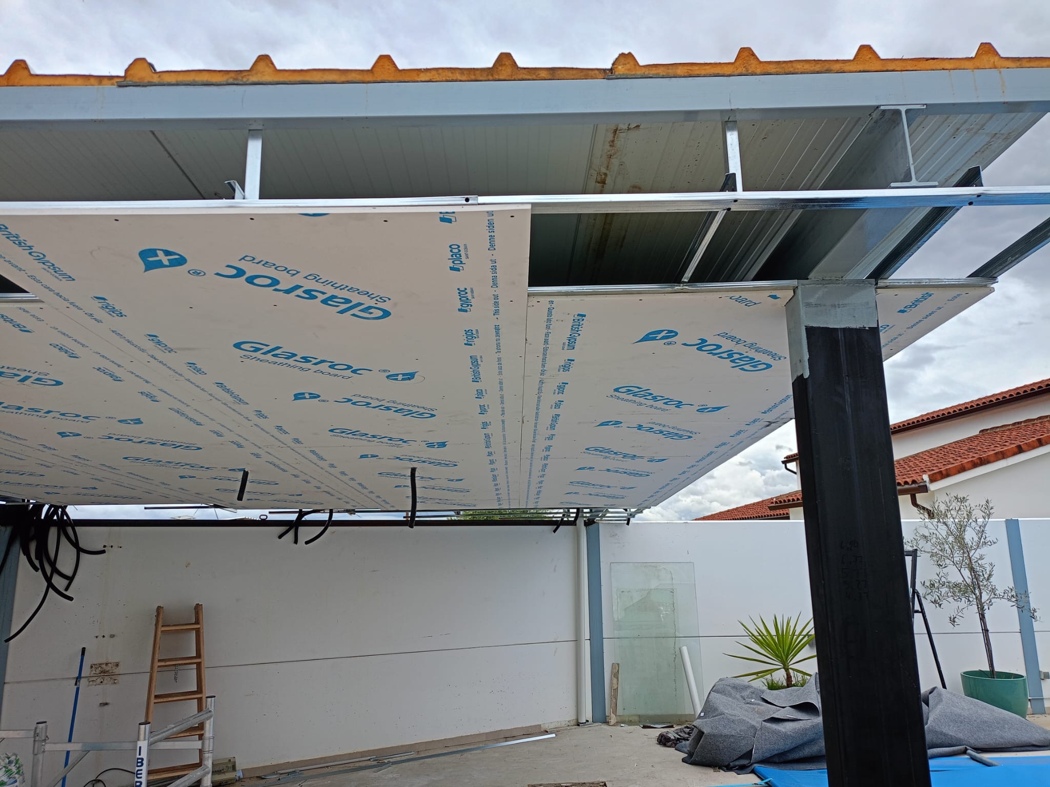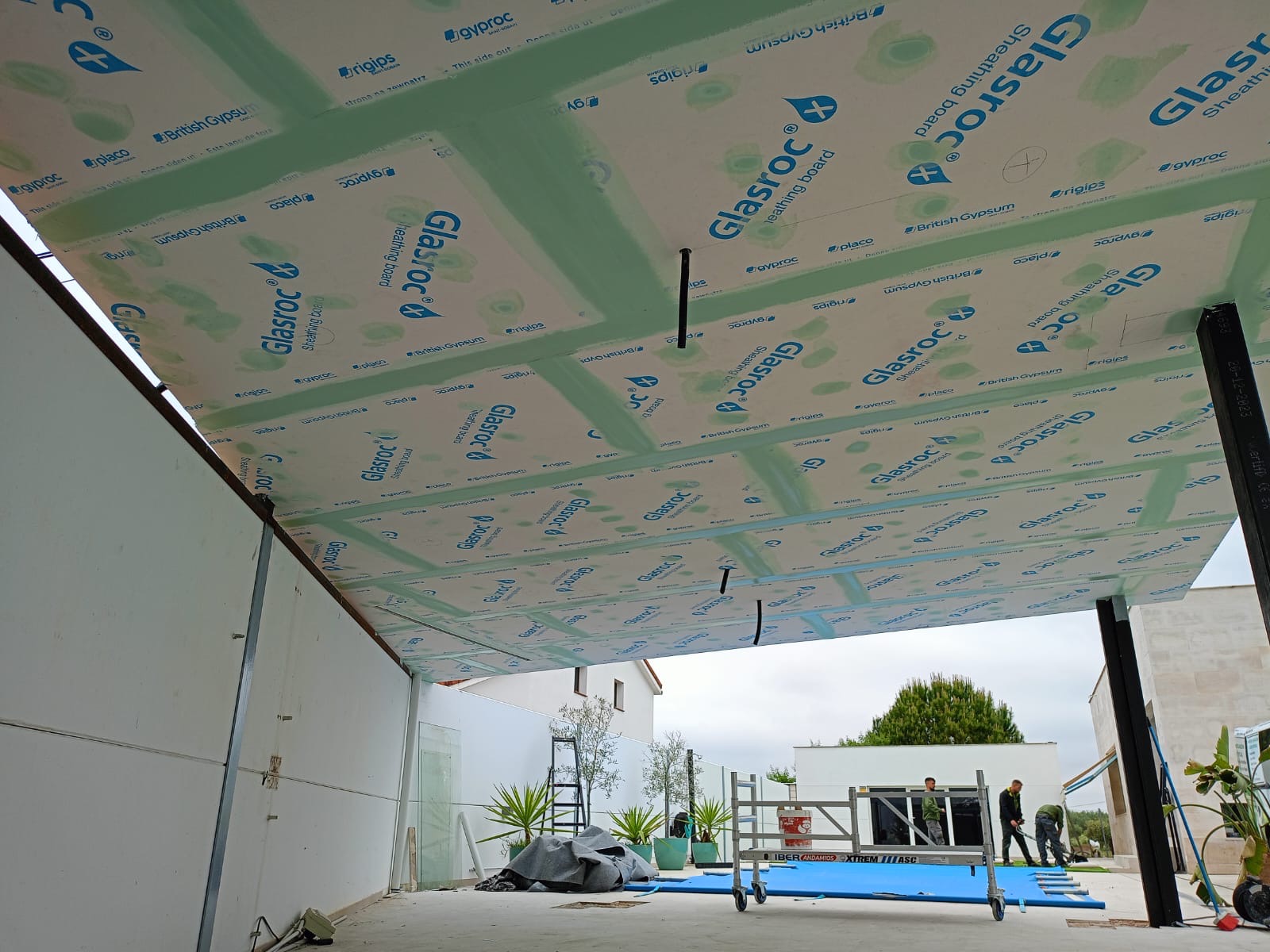 En la pérgola exterior se ha ejecutado un techo continuo con placa Glassroc X, especialmente diseñada para aplicaciones en exteriores. Esta placa, resistente a la humedad y a las condiciones climáticas adversas, garantiza una larga durabilidad y un acabado de alta calidad.